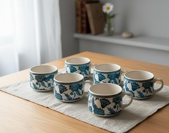 Includes 6 matching ceramic cups with comfortable handles, ideal for serving tea, coffee, or other hot beverages to family and guests