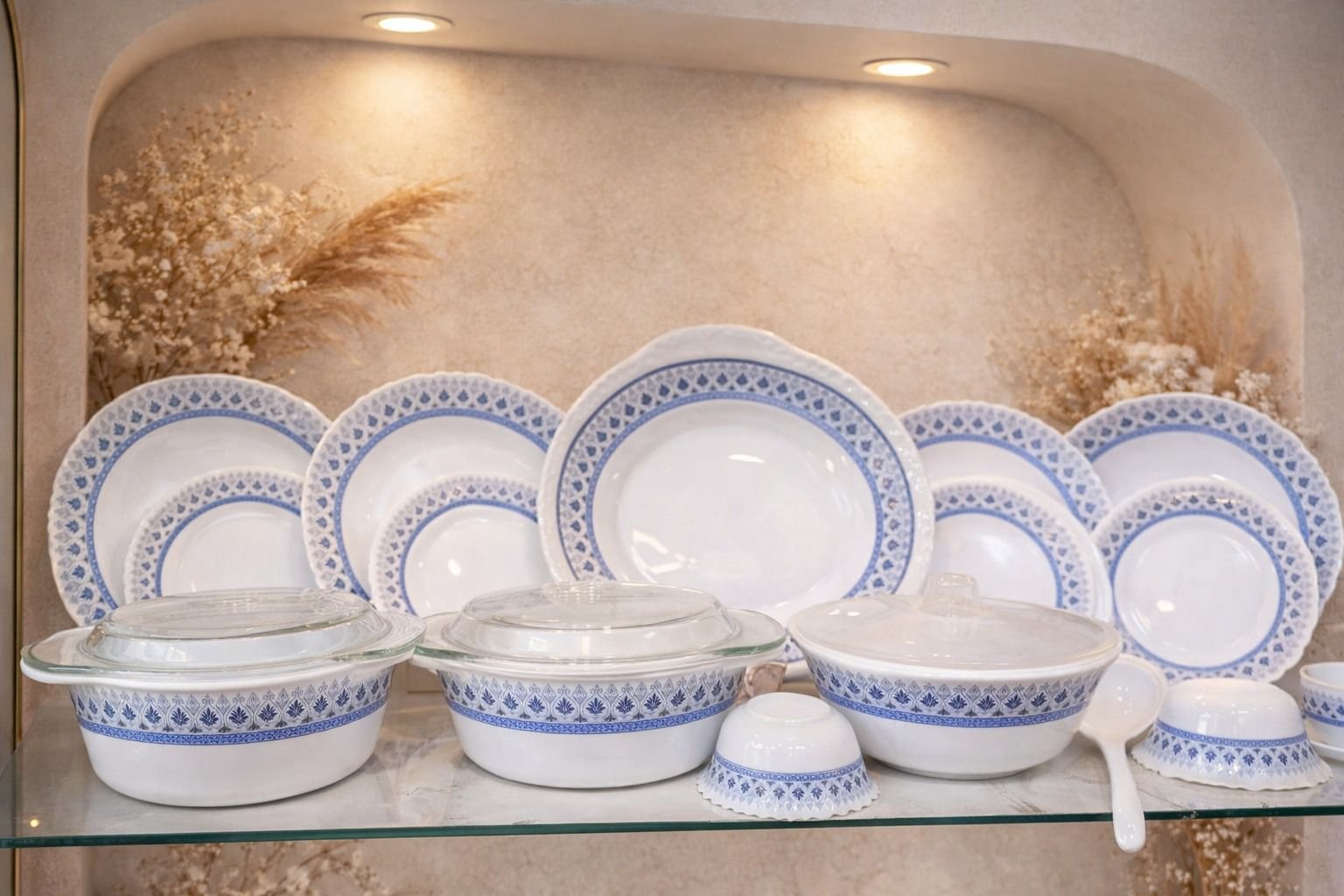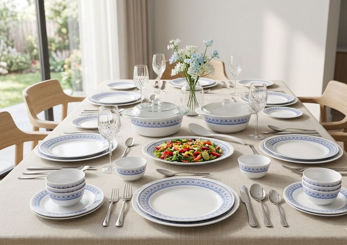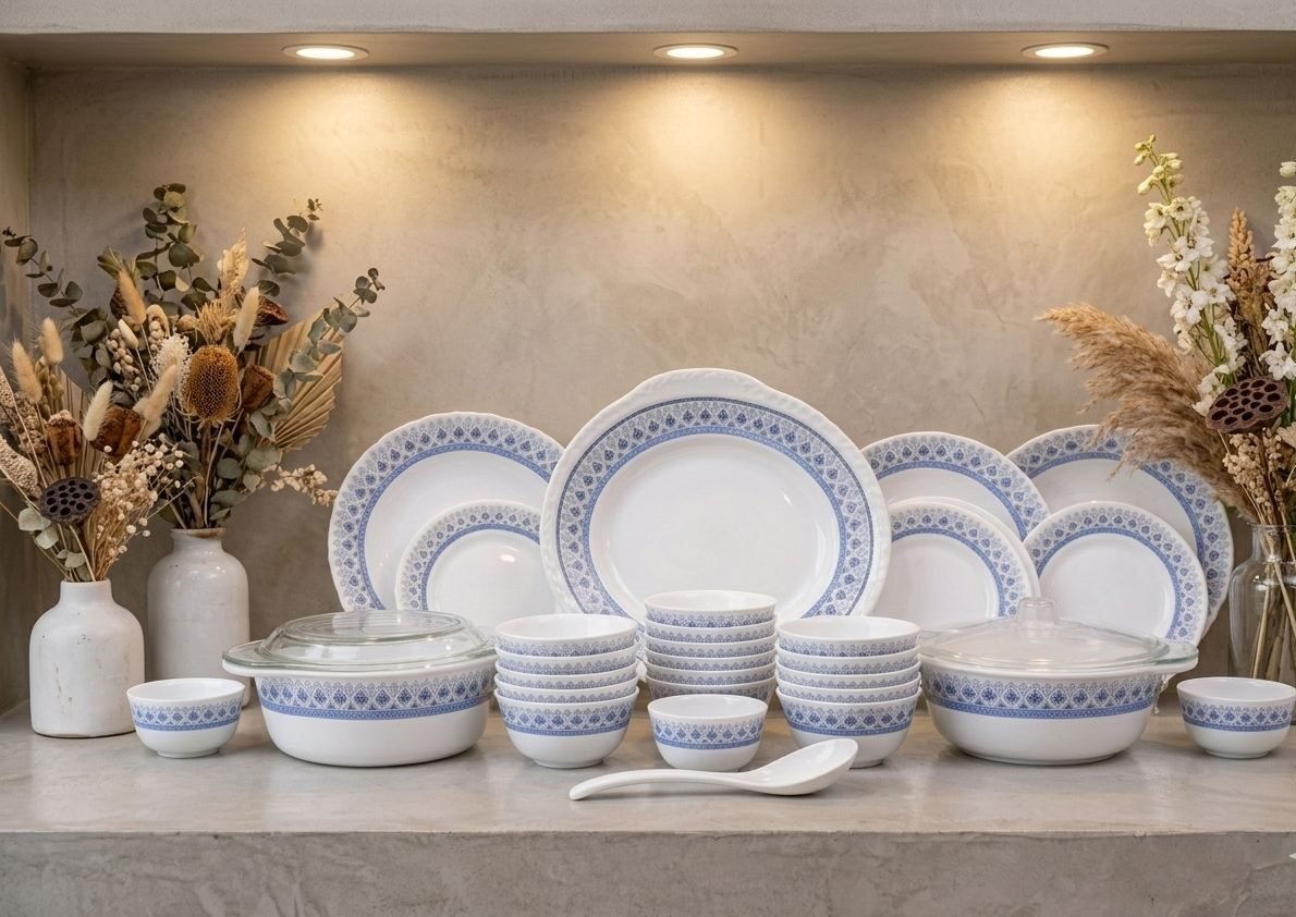 Dinner Plates, Quarter Plates, Soup Bowls, Veg Bowls, Serving Bowls with Lid, Glass Lid Casseroles, Serving Dish, Ladle Spoon, and Additional Matching Tableware Pieces
