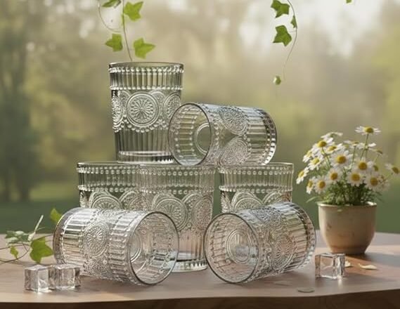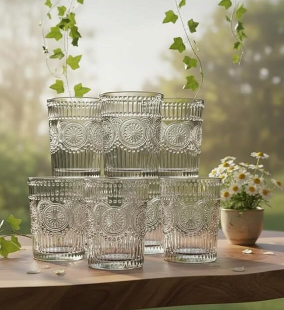 Vintage-inspired embossed glass tumblers featuring intricate crystal-like patterns with detailed sunburst medallions and textured vertical ribbing