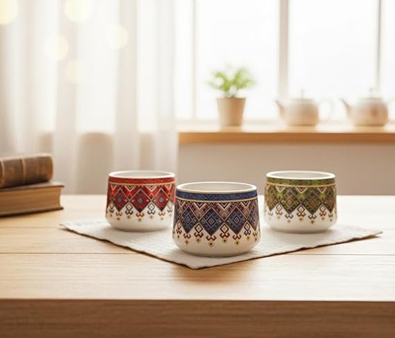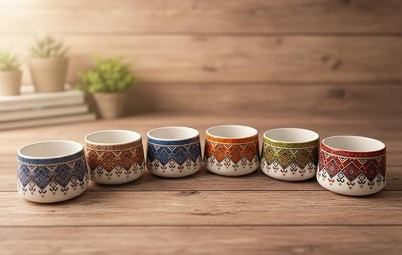 This ceramic cup set includes 6 beautifully designed round cups, each with 150ml capacity, perfect for serving tea, coffee, or hot beverages to family and guests