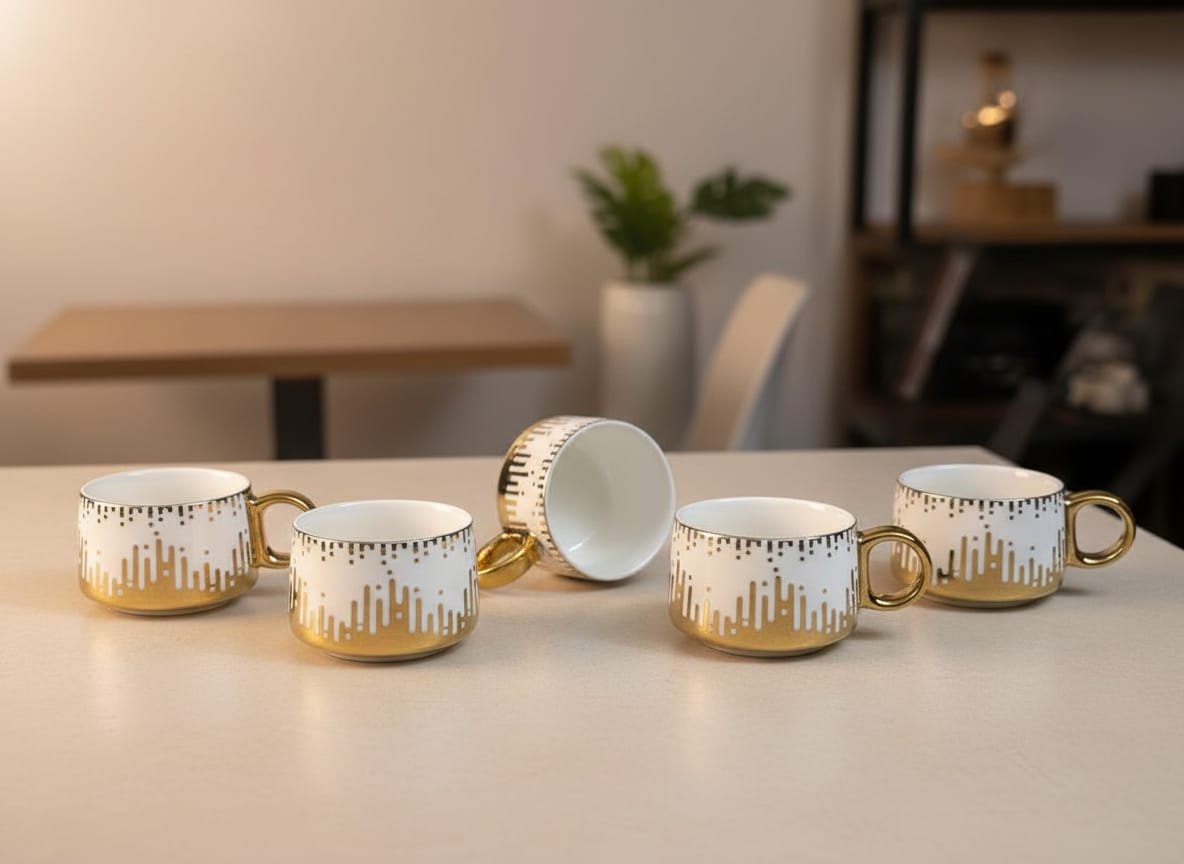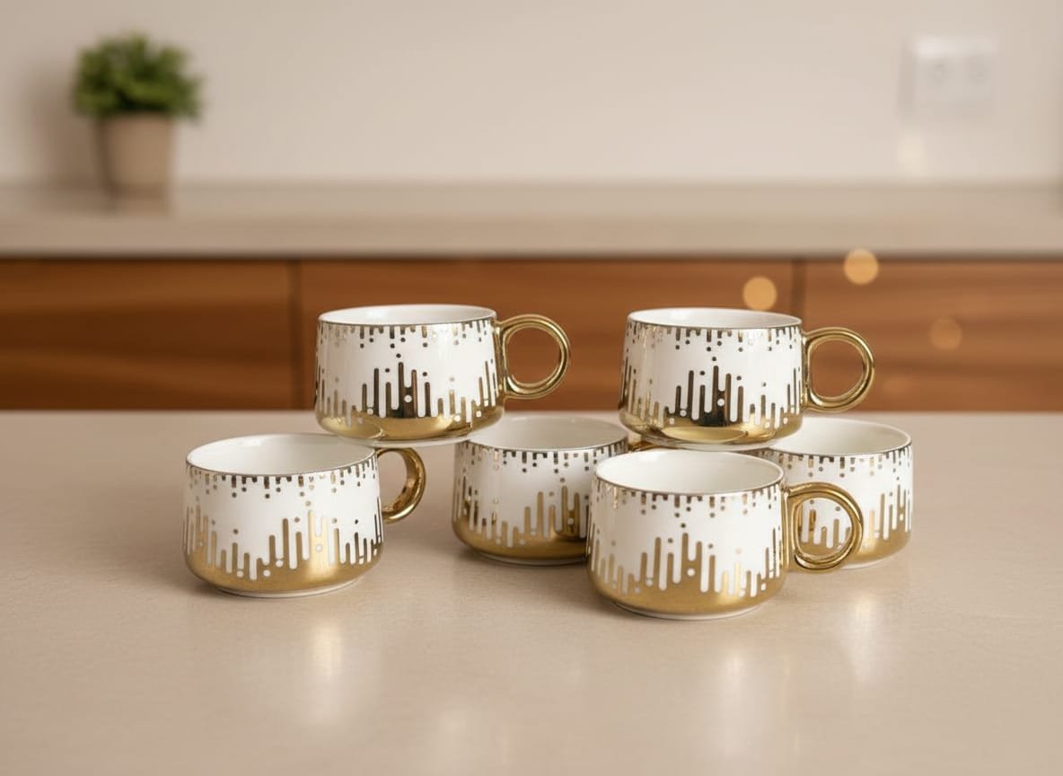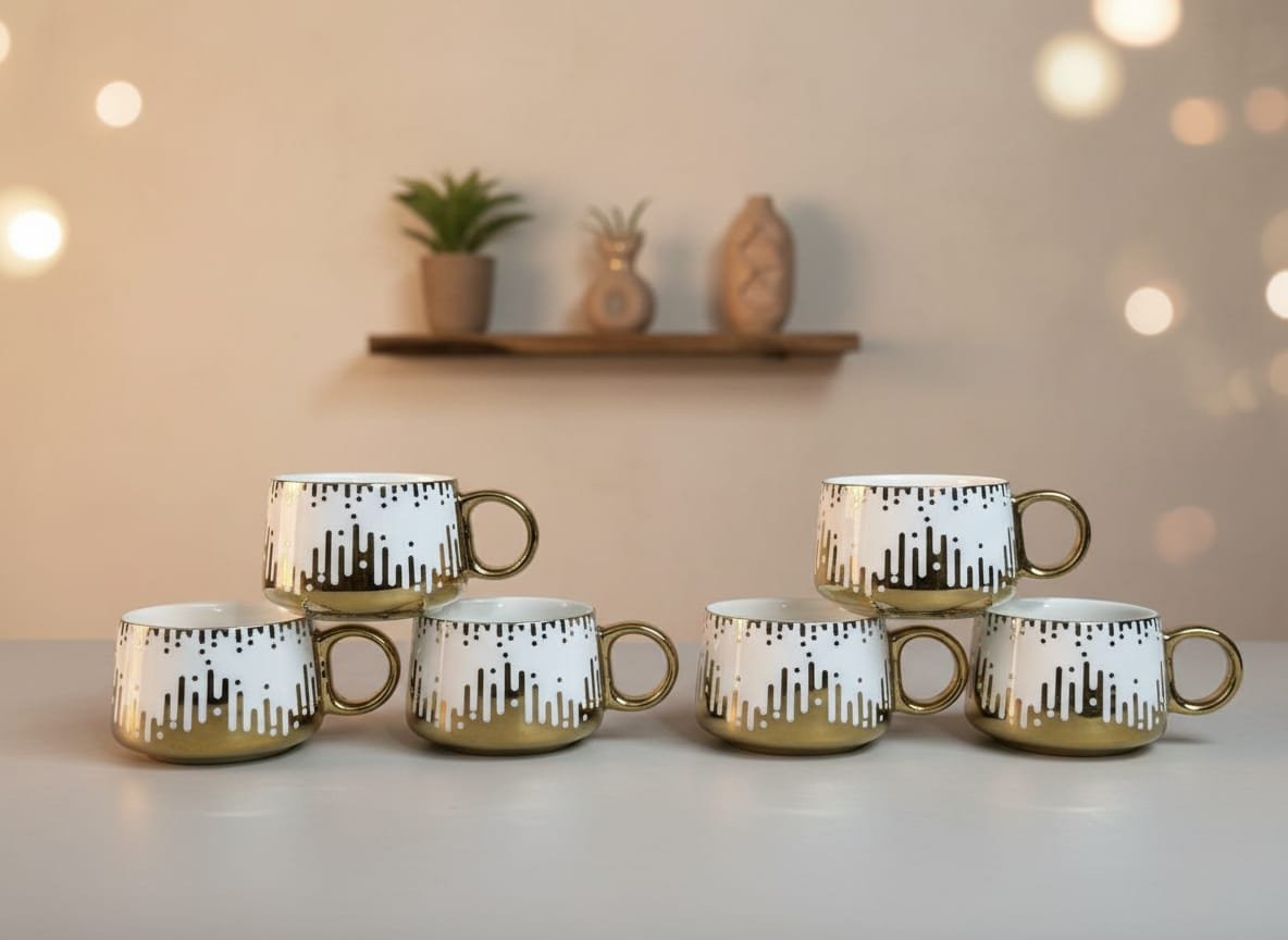 Set of 6 elegant tea and coffee cups crafted from high-quality porcelain with a sophisticated white and gold geometric pattern design