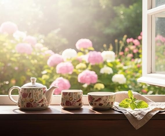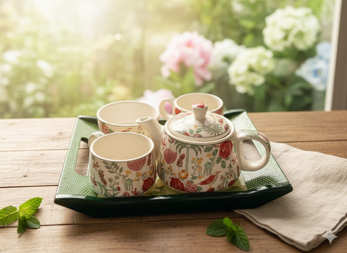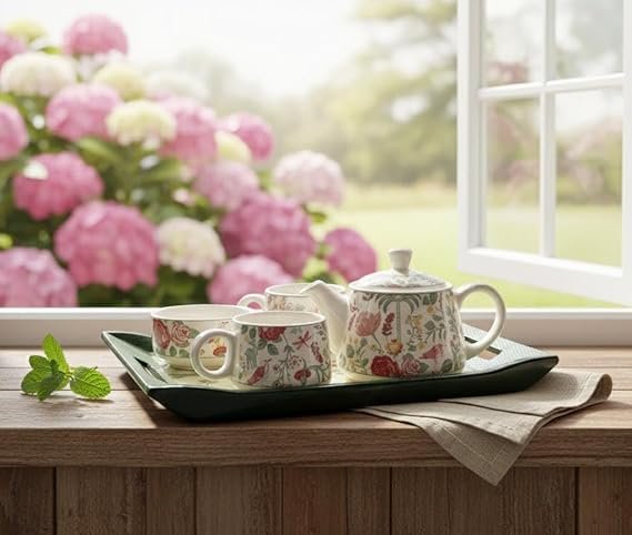 Includes a matching teapot with lid, tea cups, and serving tray, creating a coordinated and sophisticated tea service ensemble