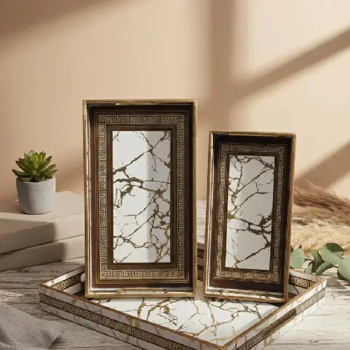 This exquisite 3-piece tray set combines timeless classical motifs with modern luxury. Each tray features a stunning white marble-effect base accented by radiant gold veining and a bold Greek Key border that exudes sophistication. The raised edges and built-in handles provide both security and style, making this set a perfect blend of decorative art and practical utility. Whether nested together for display or used individually for service, these trays bring an opulent aesthetic to any room.