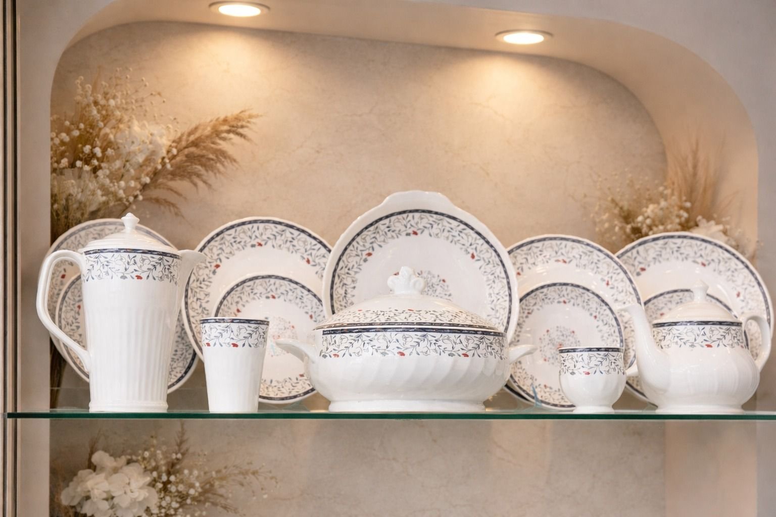 Dinner Plates, Quarter Plates, Soup Bowls, Veg Bowls, Tea Cups, Saucers, Serving Bowls with Lid, Teapot, Milk Pot, Sugar Pot, and Additional Matching Tableware Pieces