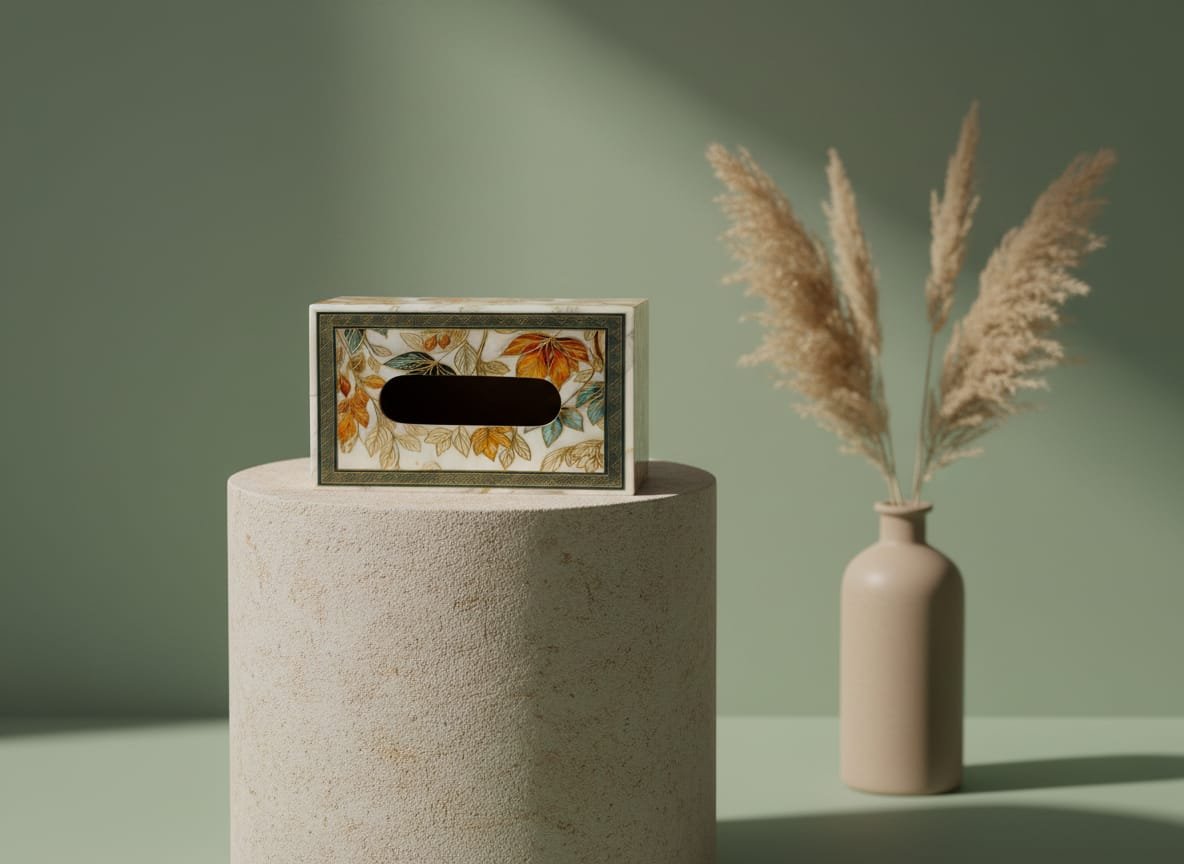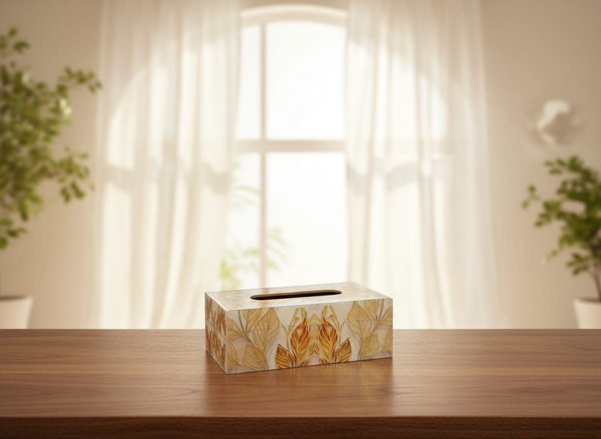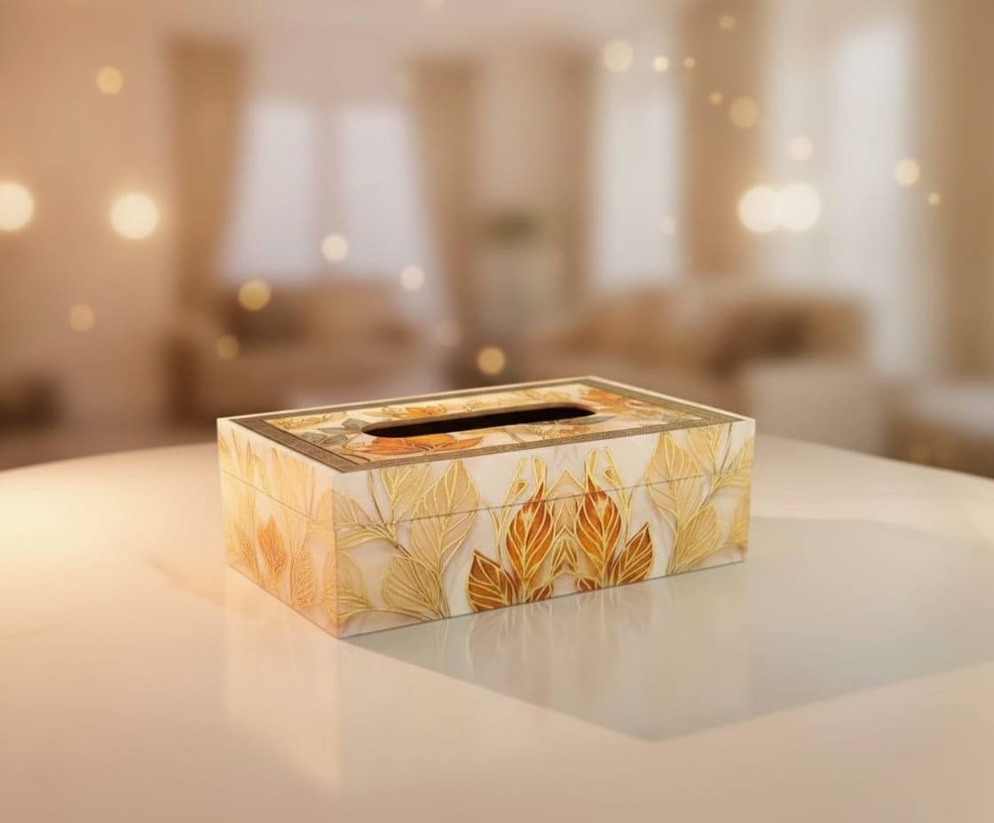 A beautifully crafted rectangular tissue box cover featuring a warm cream background with golden and amber leaf motifs. Designed to add a touch of elegance to your living space, this decorative cover neatly conceals standard tissue packs while complementing modern interiors. Perfect for living rooms, bedrooms, offices, or dining tables, it combines functionality with sophisticated style.