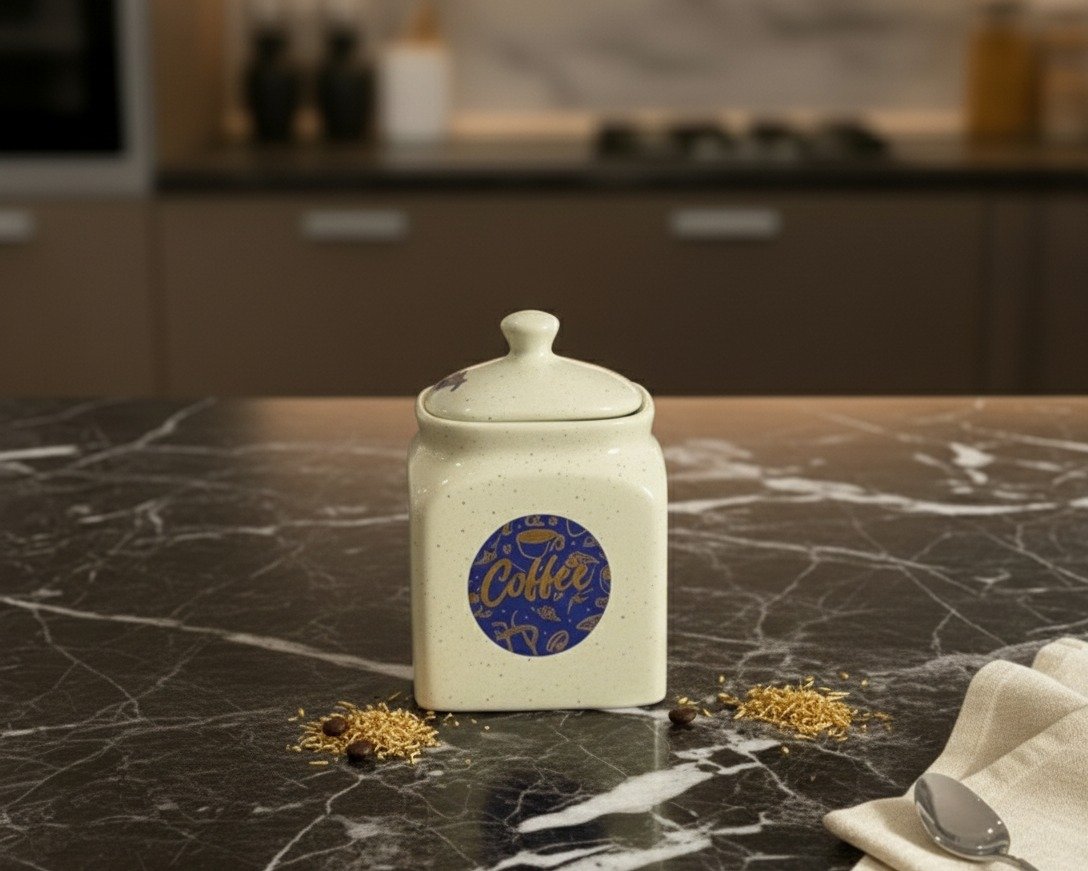 The center of each canister is adorned with a deep navy circular decal featuring elegant gold-toned script for Sugar, Coffee, and Tea, surrounded by intricate botanical and coffee-themed illustrations. Designed with both form and function in mind, the square-based silhouette saves space on your counter, while the fitted lids ensure your ingredients stay fresh and flavorful.